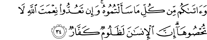 ၀၁၄ း ၃၄။ ထိုမွတစ္ပါး ထိုအရွင္ျမတ္သည္ အသင္တို႔အား ထိုအရွင္ျမတ္အထံေတာ္၌ အသင္တို႔ အသနားခံခဲ့ၾကသည့္အရာ အလံုးစံုတို႔အနက္မွလည္း ခ်ီးျမႇင့္ေပးသ နားေတာ္ မူခဲ့ေပသည္။ စင္စစ္ေသာ္ကား အကယ္၍ အသင္တို႔သည္ အလႅာဟ္အရွင္ျမတ္၏ ေက်းဇူးေတာ္ (မ်ား)ကိုေရတြက္ၾကသည္ရွိေသာ္ အသင္တို႔သည္ ယင္းေက်းဇူးေတာ္(မ်ား)ကို ေရတြက္ႏိုင္ၾကမည္ မဟုတ္ေပ။ မလြဲဧကန္ မႏုႆလူသား(တို႔)သည္ အမွန္ပင္ အလြန္မတရားေသာသူ(မ်ား) အလြန္ ေက်းဇူးကန္းသူ(မ်ား)ပင္ ျဖစ္(ၾက)ေပသတည္း။