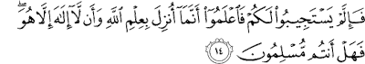 ၀၁၁ း ၁၄။ တဖန္ အကယ္၍ ၎တို႔သည္ အသင္တို႔ (ေျပာဆိုၾကသည္)ကို ေျဖဆိုျခင္း မျပဳခဲ့ၾကပါလွ်င္ (ဤကုရ္အာန္က်မ္းေတာ္ျမတ္သည္) အလႅာဟ္္အရွင္ျမတ္၏ အသိပညာျဖင့္ ခ်ေပးသနားေတာ္မူျခင္း ခံခဲ့ရသည္သာလွ်င္ ျဖစ္ေၾကာင္းကိုလည္းေကာင္း၊ ထိုအရွင္ျမတ္မွတစ္ပါး ခ၀ပ္ကိုးကြယ္ရာအရွင္ဟူ၍ အလွ်င္း မရွိေၾကာင္းကိုလည္းေကာင္း၊ အသင္တို႔ ေကာင္းစြာယံုၾကည္ၾကေလကုန္။ သို႔ျဖစ္ေပရာ ယခုေသာ္လည္းအသင္တို႔သည္ မုစ္လင္မ္ အမိန္႔ေတာ္ကို လိုက္နာေသာသူမ်ား ျဖစ္ၾကၿပီေလာ။